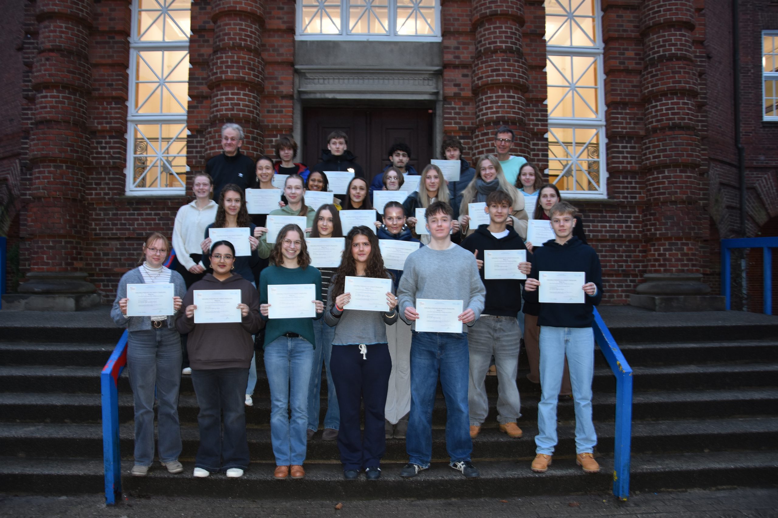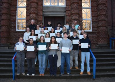 Aus den damaligen 9. Klassen haben 15 Schüler*innen das ihrem Lernjahr entsprechende Niveau A2 erlangt und aus dem E-Jahrgang schafften 14 Schüler*innen das zu ihnen passende Niveau B1. Dabei wurden in beiden Gruppen zusammen sogar fünfmal Traumwerte von über 90 % erreicht (Spitzenwert 98%) – génial!