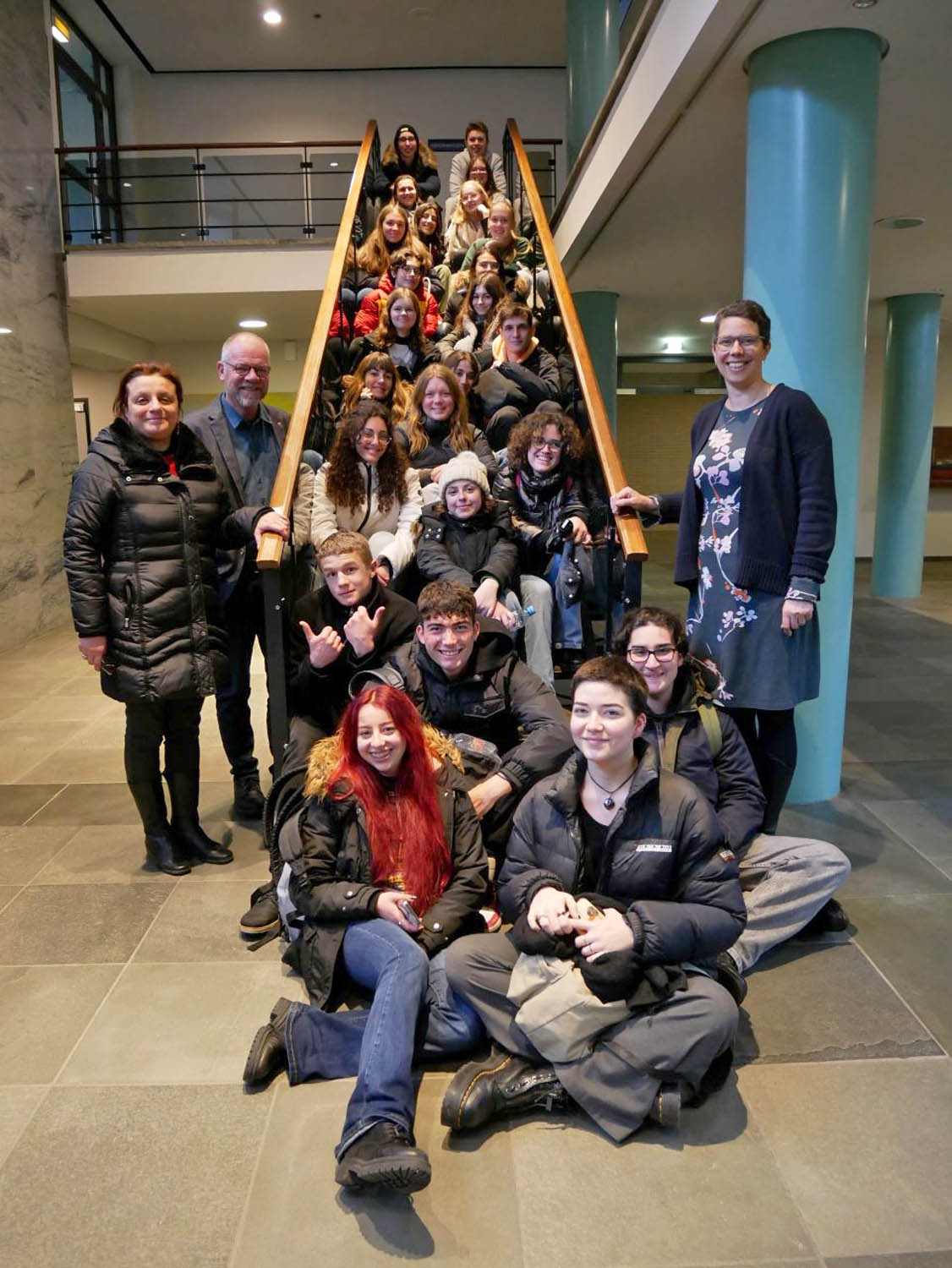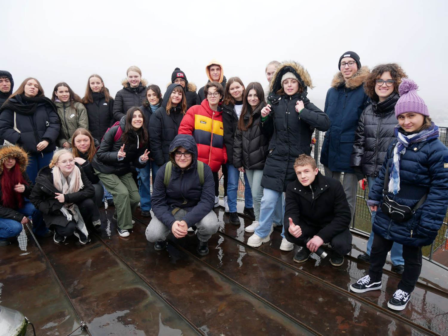 16 Schüler*innen kamen am 20.03.23 in Flensburg an. Heute konnten wir alle in der Aula begrüßen. Nach verschiedenen Kennlernspielen und der Begrüßung von Arnd Reinke folgte der obligatorische und beeindruckende Besuch mit Gerd Hoffmann auf der Kuppel der Schule.