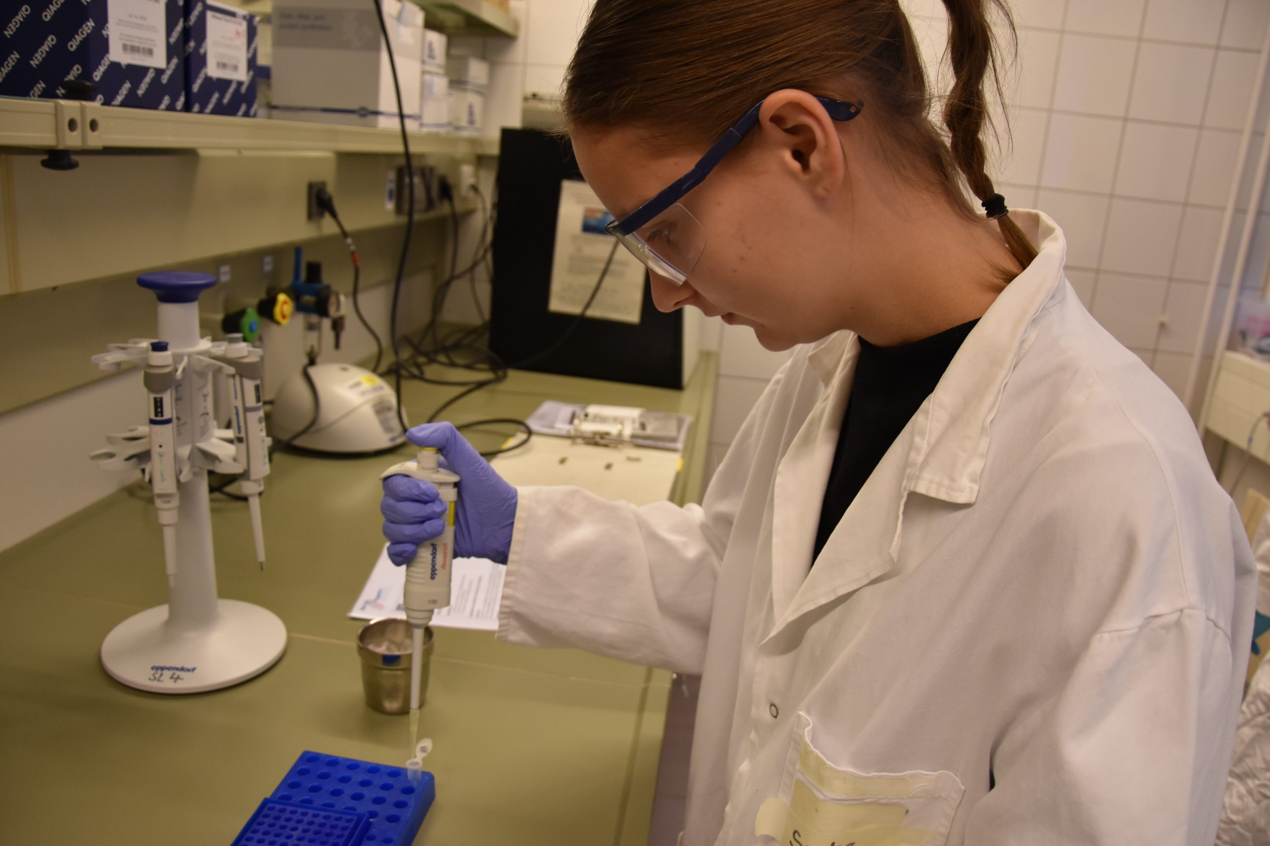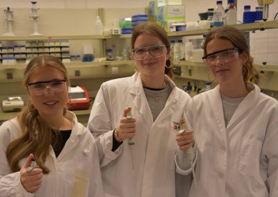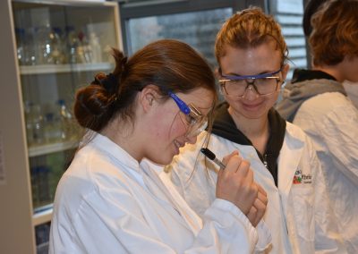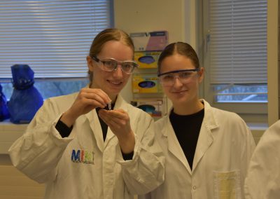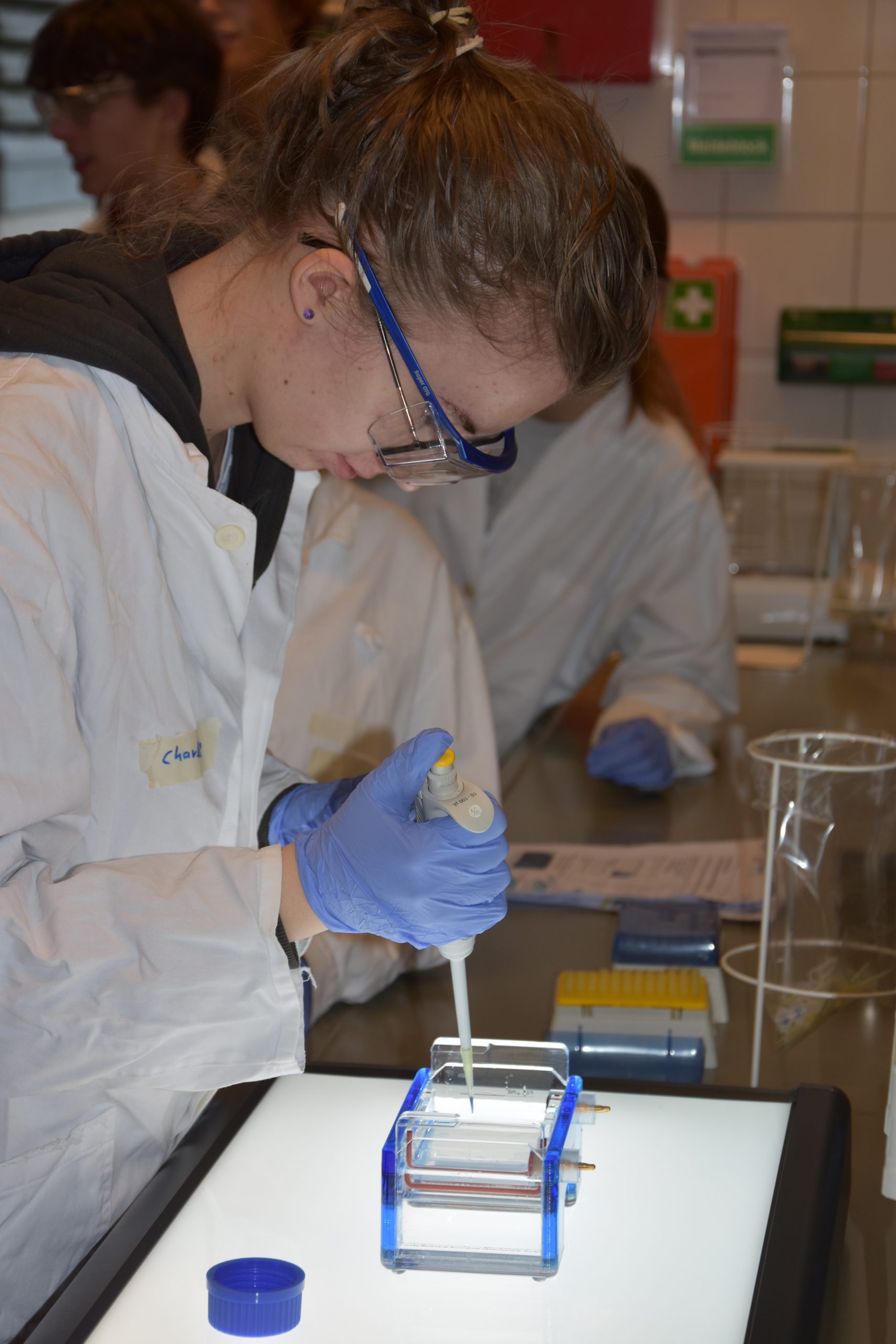 In entspannter Atmosphäre bei Kaffee und Keksen beginnt der Tag um 9 Uhr mit anschaulichen Präsentationen zum Theorie-Hintergrund. Während einer kurzen Pause können alle diese Informationen verdauen, um sich dann für die Laborarbeit vorzubereiten: Haare hochbinden, weiße Kittel und Schutzbrillen anziehen, Hände waschen sowie desinfizieren.