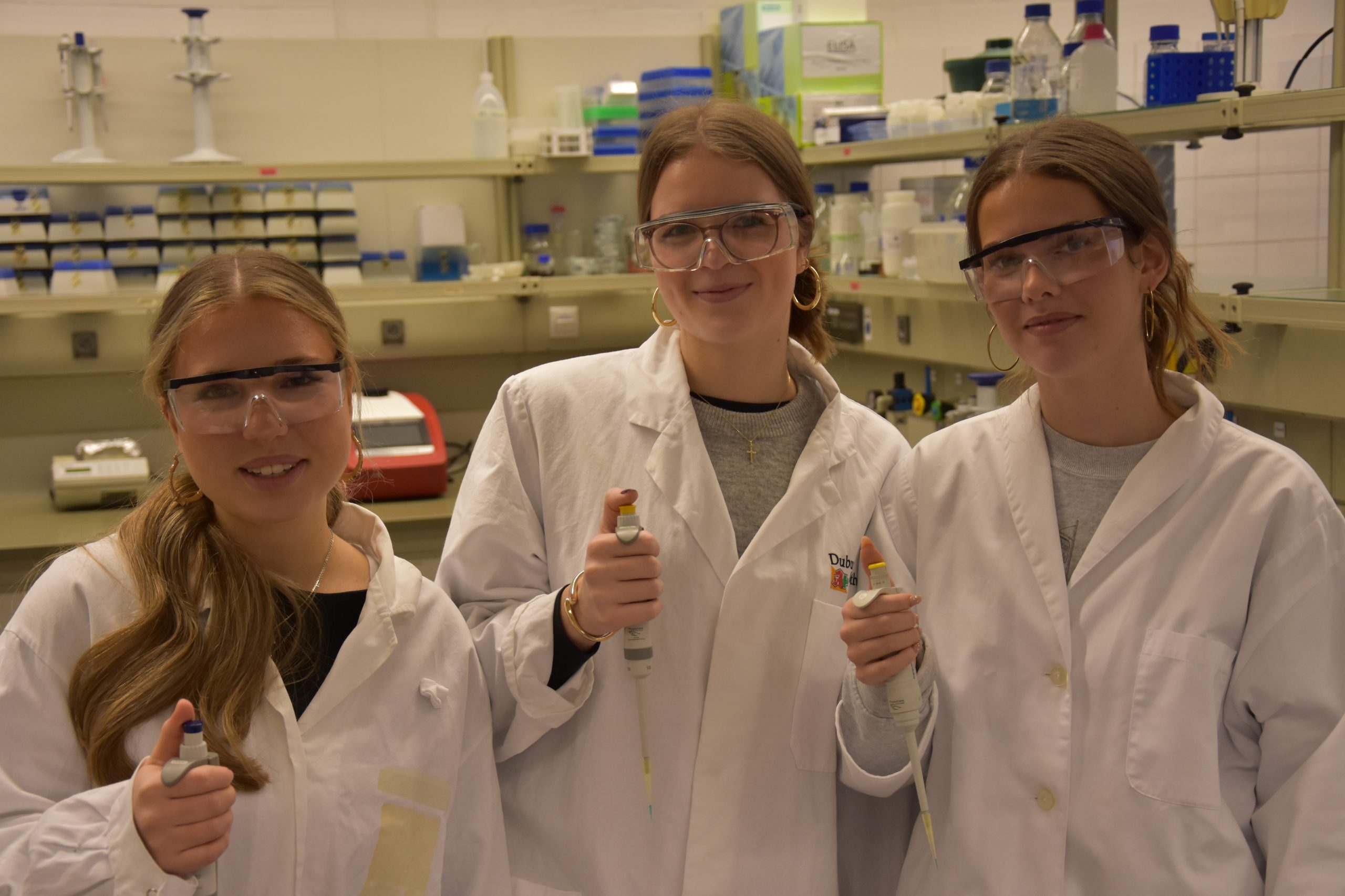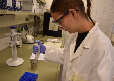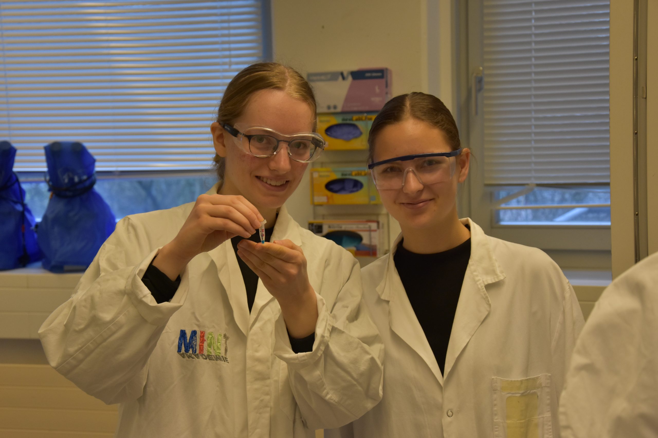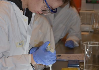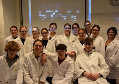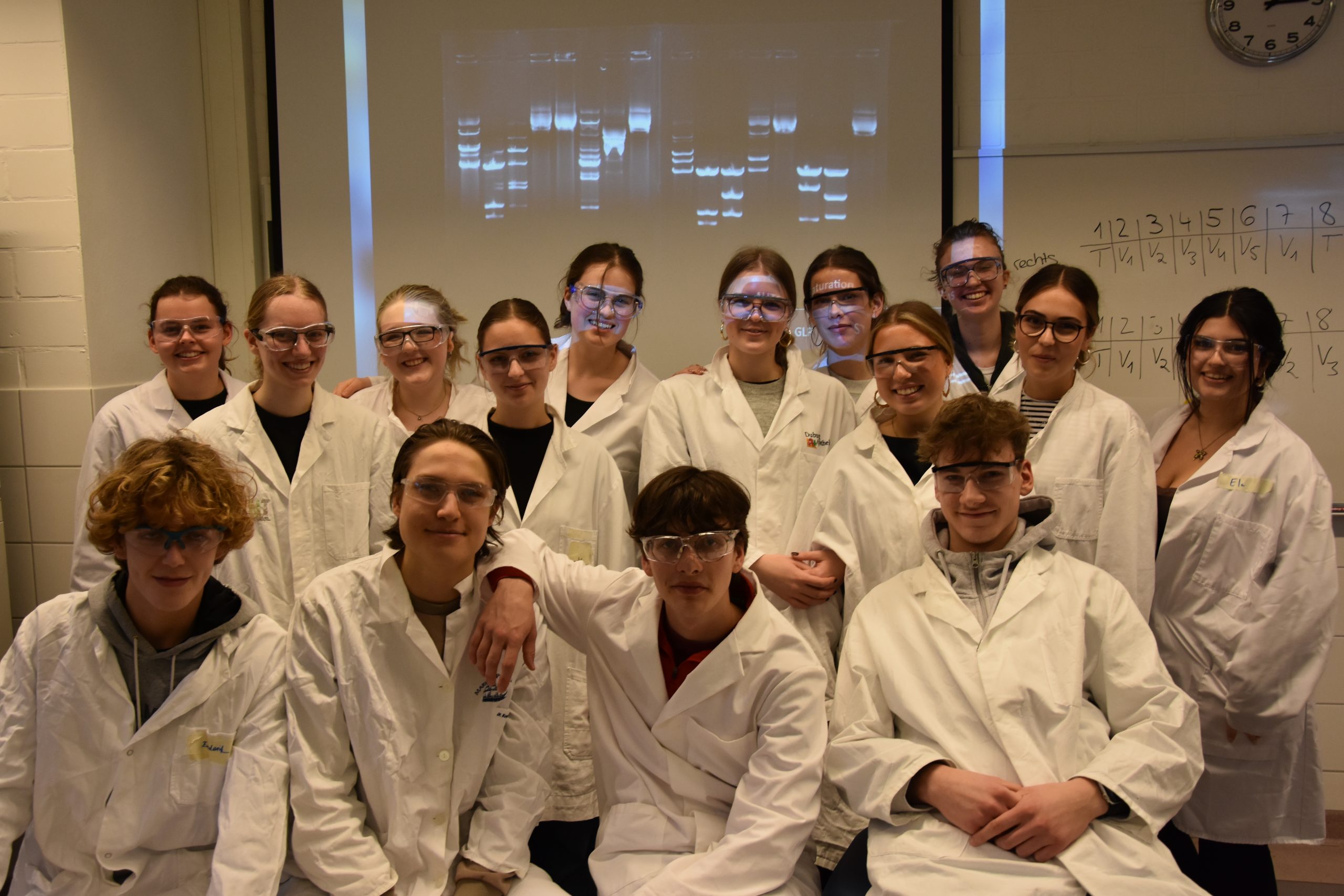 In entspannter Atmosphäre bei Kaffee und Keksen beginnt der Tag um 9 Uhr mit anschaulichen Präsentationen zum Theorie-Hintergrund. Während einer kurzen Pause können alle diese Informationen verdauen, um sich dann für die Laborarbeit vorzubereiten: Haare hochbinden, weiße Kittel und Schutzbrillen anziehen, Hände waschen sowie desinfizieren.