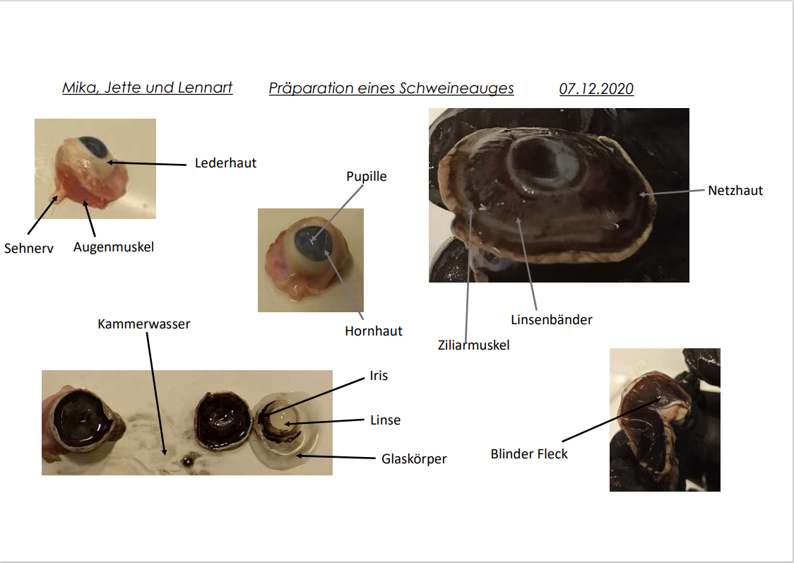 Sezieren stellt in seiner Form des haptischen Lernens eine besondere und nachhaltige Bereicherung des Unterrichts dar und ist auch fest im schulinternen Fachcurriculum verankert. So führen Neuntklässler*innen jedes Jahr eine Schweineaugenpräparation durch, wenn sie das möchten. Sollten sie fürchten, dass dieses chirurgische Arbeiten bei Ihnen zu emotionalen Reaktionen führt, so haben sie die Möglichkeit, in der jeweiligen Stunde auf Wunsch eine dem Thema entsprechende Aufgabe außerhalb des Fachraums zu lösen.